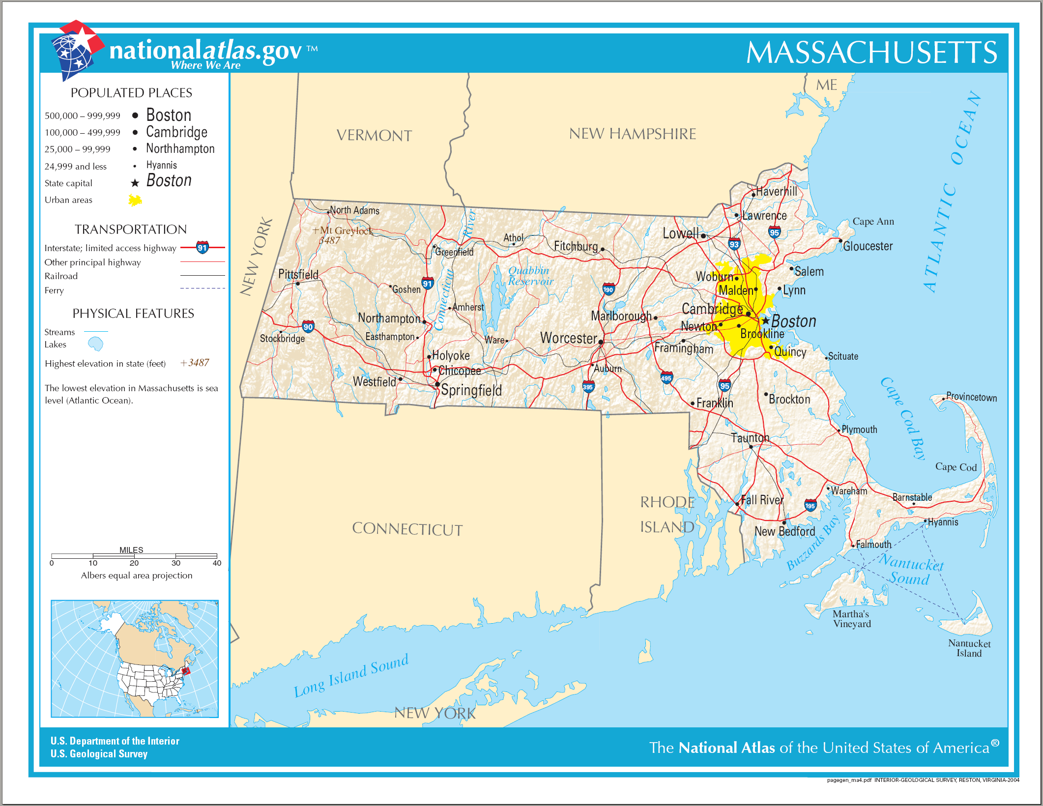 Landkarte des Staates Massachusetts (MA), USA
